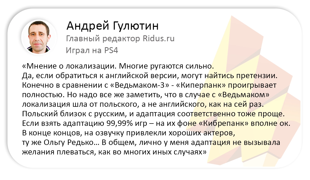 Тем не менее, если всё же быть объективными, локализация «Киберпанка» явно не дотянула до уровня предшественницы.