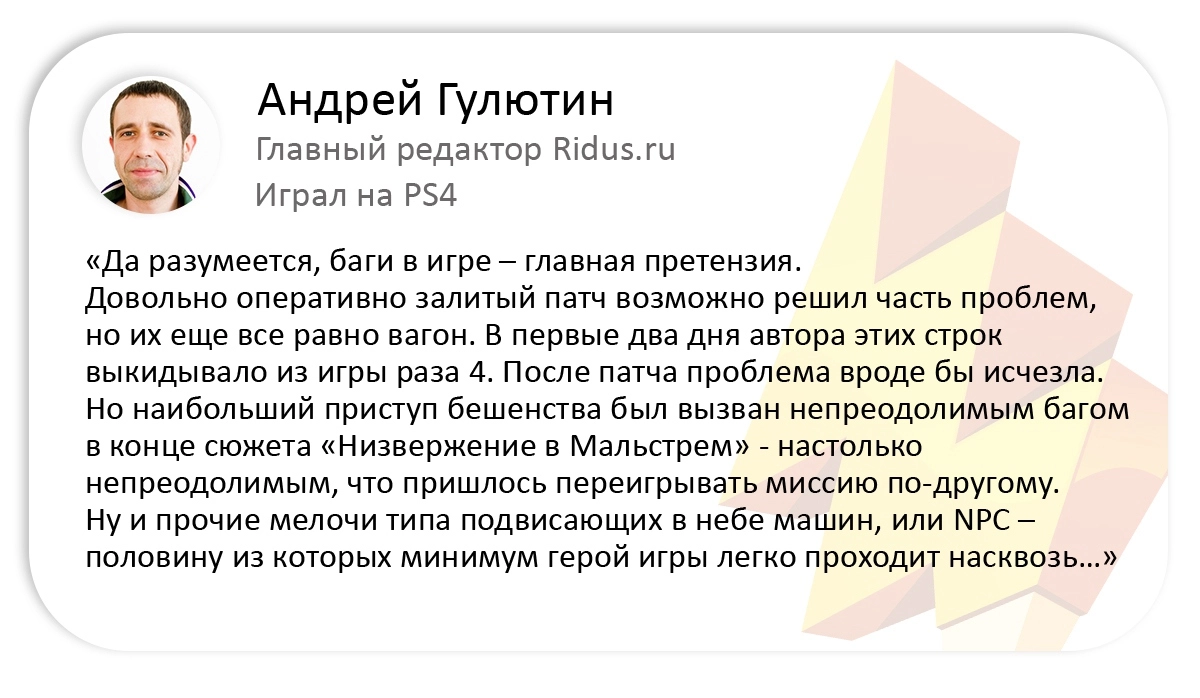 Тем не менее, как ни странно, у большинства геймеров даже изобилие разнообразных багов не отбивает желание играть дальше. Кроме того, сотрудники «Ридуса» справедливо указывают на то, что подавляющее большинство распиаренных проектов прошлых лет несло в себе ровно те же проблемы: достаточно вспомнить продукты Ubisoft или ранние игры от Obsidian — последние фанаты исправляют самостоятельно до сих пор.