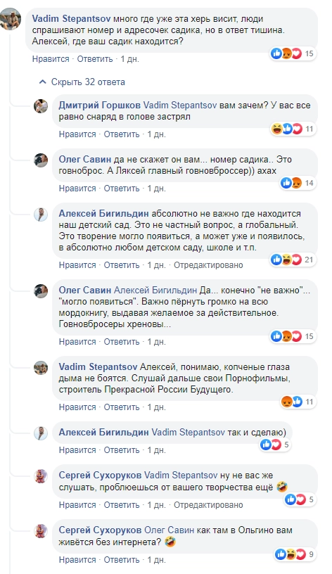 2. Бигильдину задавали вопросы, в каком детсаду это произошло. Он не отвечал. Вместо него появилась в комментах какая-то девушка и написала: «Я знаю Алексея, это не фейк, а номер детсада он не скажет, потому что никто не станет обнародовать информацию о том, в какой детсад ходит его ребенок!» (Ну как бы… а как вообще жаловаться на детсад или на школу, не сообщая, о каком из них идет речь?)