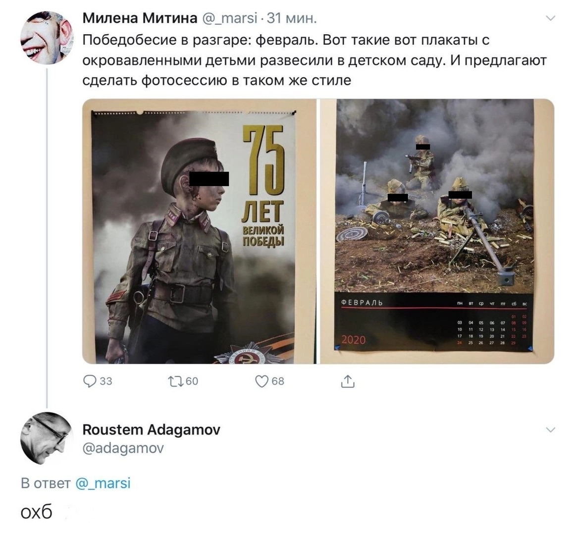 Коллеги, почитав внимательнее про военный календарь с детьями, думаю, что это с большой вероятностью фейк. То есть, сам календарь, видимо, существует — но, скорее всего, ни в каком детском саду его не вешали.