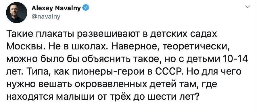 8. Но поздно! Удаленный пост Бигильдина перепостил… кто бы вы думали?.. Навальный! Сделав акцент именно на том, что кровищщу демонстрируют совсем маленьким ребятишкам, детсадовцам. И понеслось. Как-то так.