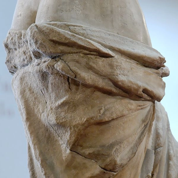 Вглядитесь в это фото: стык обоих кусков проходит под первой складкой ткани. Оба куска соединены вместе железными шипами внутри, в районе бедер.