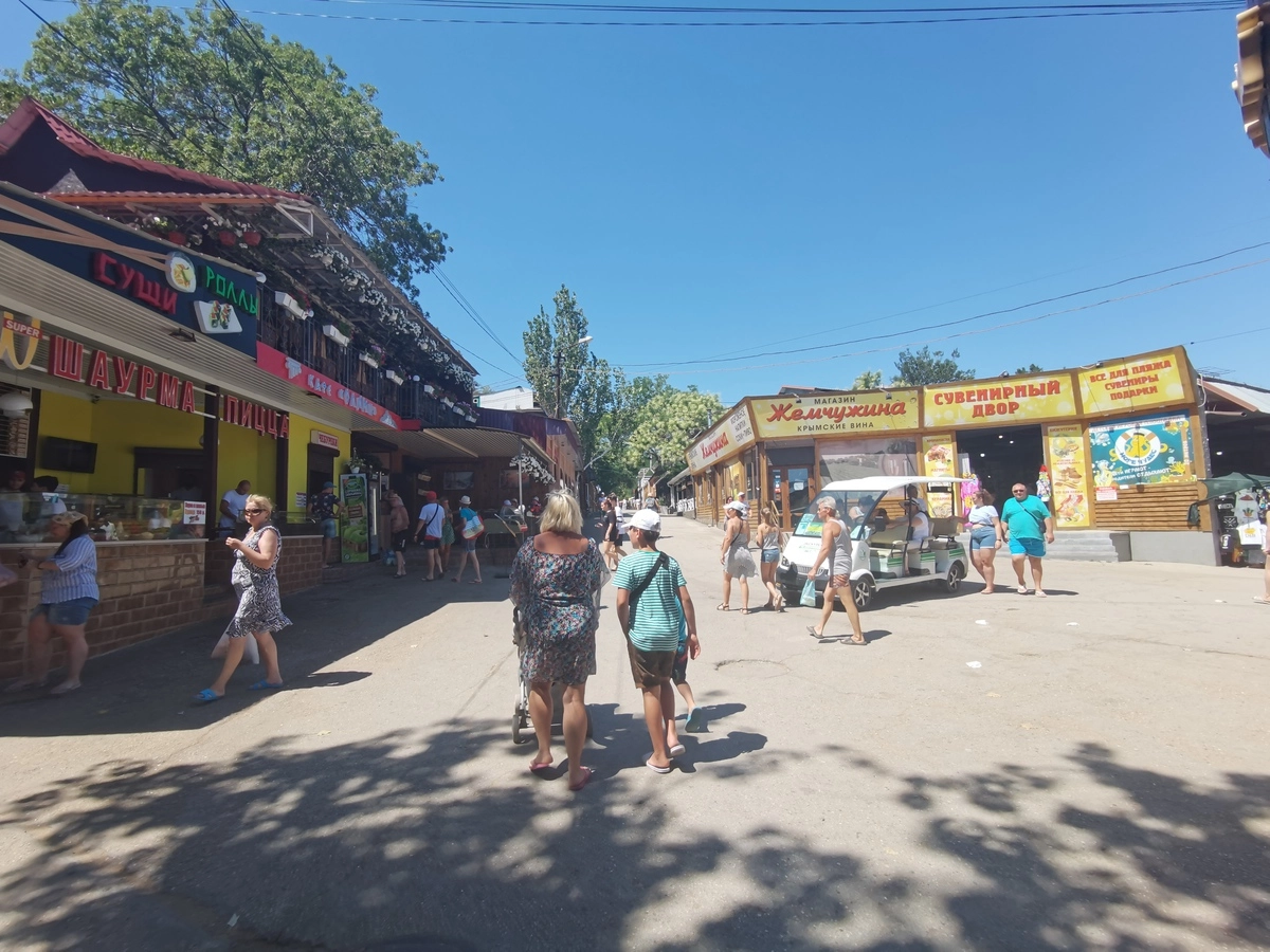 Чтобы дойти до набережной, необходимо миновать целые ряды уродливых шалманов с кричащими вывесками. Несмотря на то, что это четвертый по численности город в Крыму, с единым дизайн-кодом для объектов торговли в центральной части города власти здесь сильно не заморачиваются.