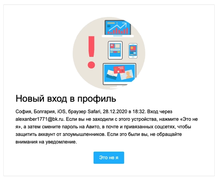То, что в аккаунт заходят из другой страны, Avito совершенно не смущает, а вот такое предупреждение приходит уже на чужой e-mail.