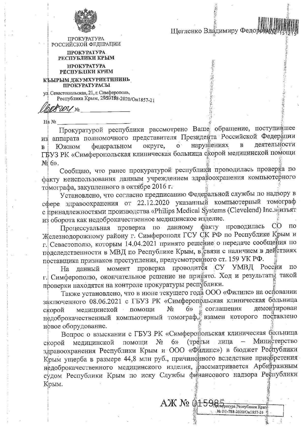 Тогда крымчане начали массово обращаться в аппарат полпреда с просьбой взять на контроль расследование обстоятельств растраты 44,8 миллионов рублей при закупке некачественного диагностического оборудования. Напомню, ранее в ходе проверок безопасности использования томографа, Росздравнадзор пришел к выводу о несоответствии характеристик излучения аппарата заявленным требованиям.
