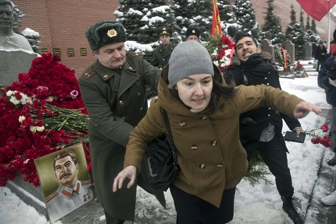 Цорионов и его спутница Мила Есипенко накануне, в 138-ю годовщину со дня рождения Иосифа Сталина, пришли к Кремлевской стене, после того как делегация КПРФ возложила цветы к могиле советского лидера.