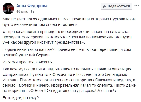 «Сначала они отправляли Путина то в Совбез, то в Госсовет, и это была прямо интрига. Потом тему пожизненного сенаторства облизывали неделю, а сейчас — молчок и ничего. Избирательная какая-то слепота. Никто даже не вскричал: „О Боже! Он идёт ещё на два срока! А я знал!“ Есть идеи, почему?» — вопрошает госпожа Федорова.