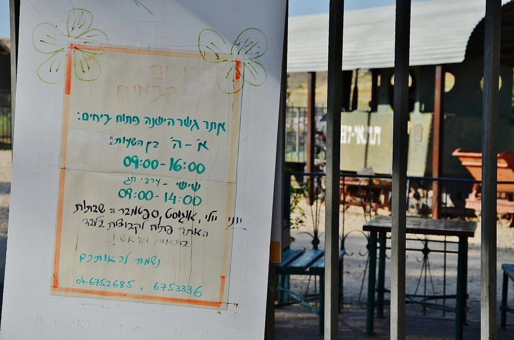 Часы работы комплекса в Гешере. Уж не знаю, почему они игнорируют иностранных туристов и не вывесили расписание на английском. Перевожу: с воскресенья по четверг 9−16, в пятницу 9−14. В субботу и праздники по предварительному согласованию. Но я вам открою секрет: за без малого 30 лет жизни в Израиле, я приезжал сюда четырежды. И ни разу комплекс не был открыт. Приезжал и в понедельник и в пятницу и когда только не приезжал. У меня ощущение, что тут все работает только для организованных групп. Когда я им звонил, стоя перед закрытыми воротами, то мне ответили, что надо согласовывать посещение заранее. А когда звонил заранее, то отвечали что-то невнятное, типа от какой вы турфирмы.