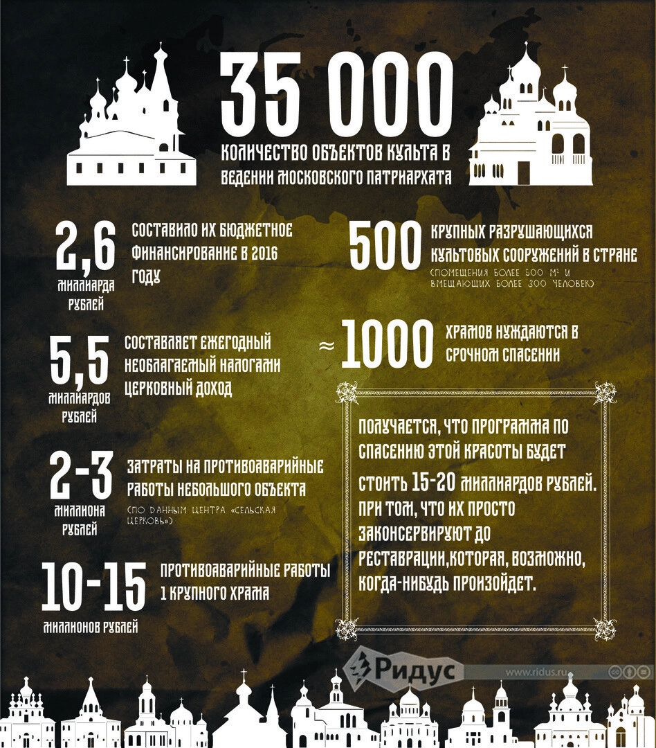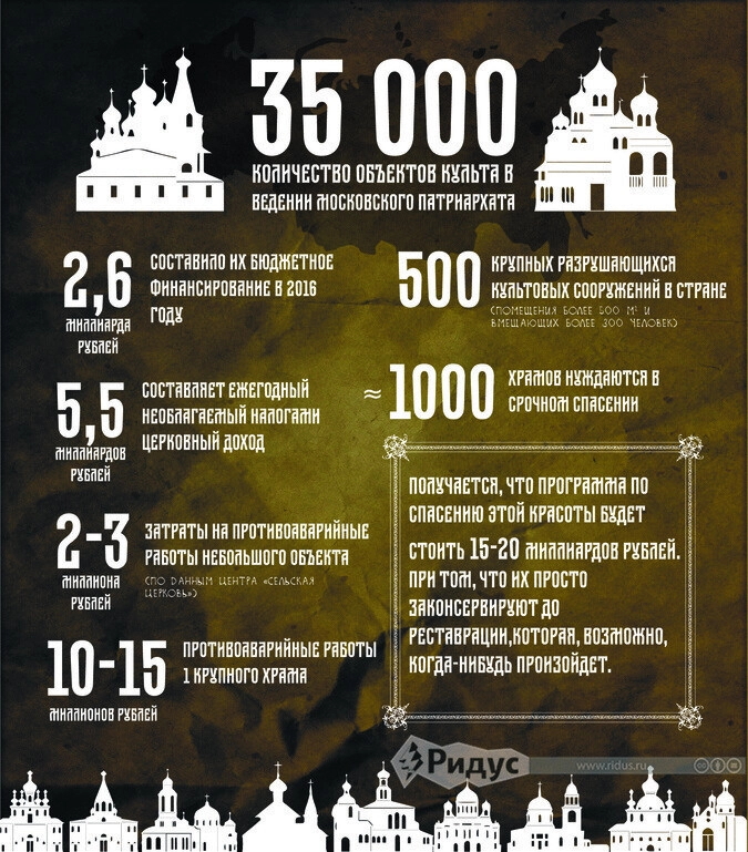 Возвращаясь же к храмам, на запрос «Ридуса», кроме прочего Минкульт ответил, что взаимодействие с РПЦ осуществляется в рамках специального меморандума, в котором прописано, что финансирование объектов религиозного назначения осуществляется с учетом мнения Финансово-хозяйственного управления Московской Патриархии. То есть, Церковь сама запрашивает нужную по своему мнению сумму, а государство уже решает, сколько оно сможет выделить.