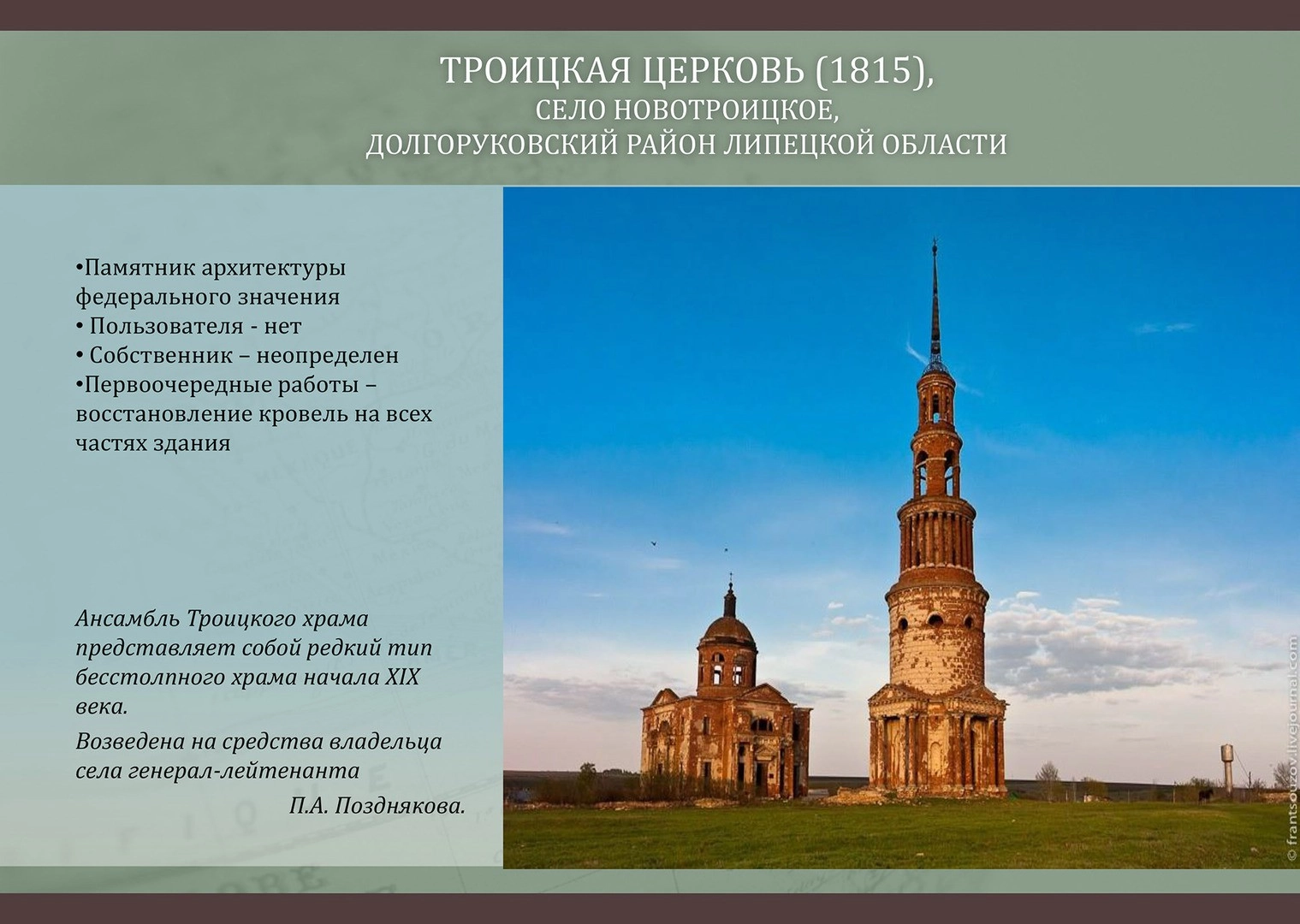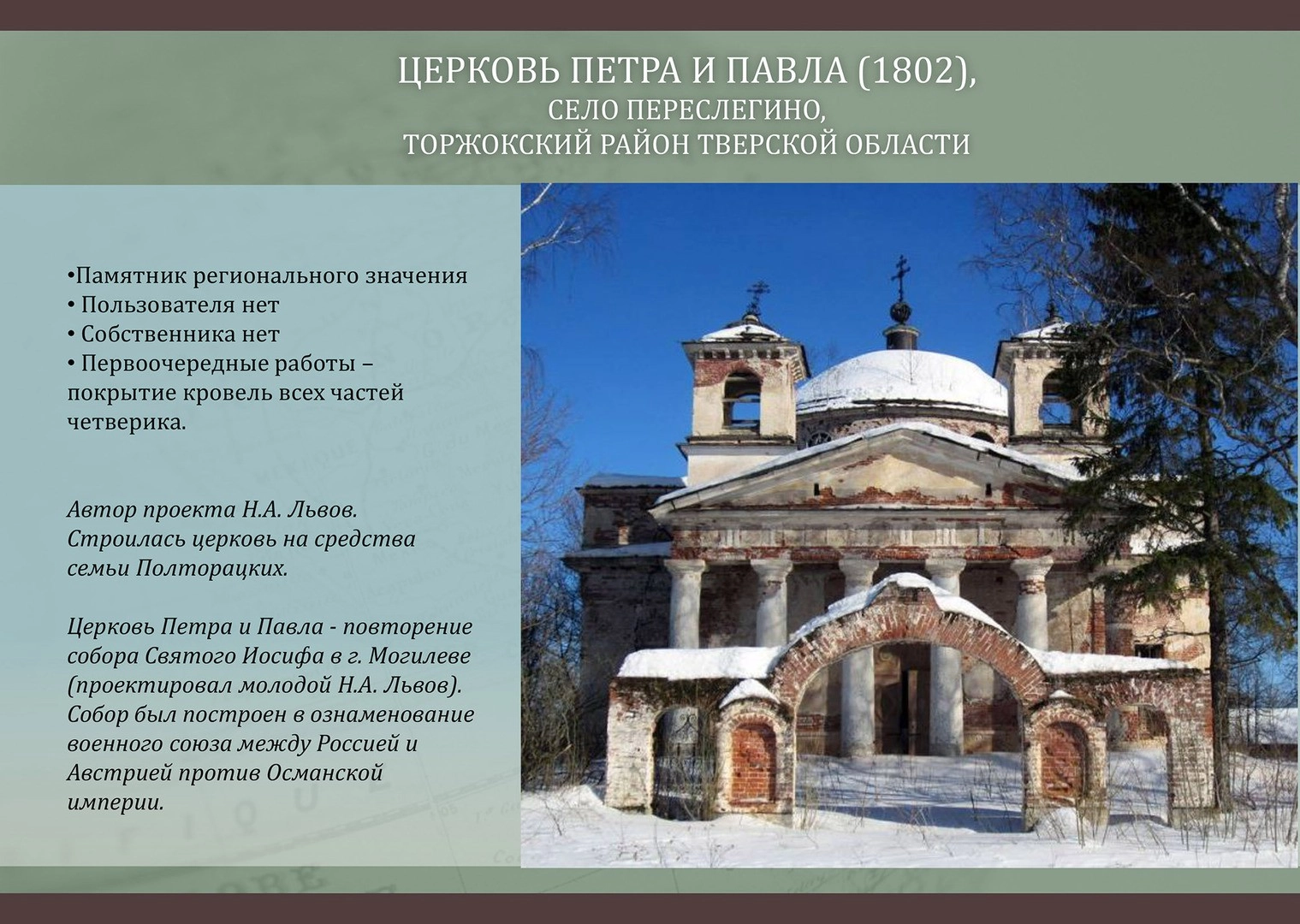 «Когда кивают на годы коммунизма — это понятно, был объявлен атеизм и поэтому одни храмы взрывали за ненадобностью, в других размещали нецерковные учреждения, — говорит общественница. — Сегодня же с экранов многое говорится о наследии, о необходимости его сохранения, а на практике практически ничего не делается для сохранения, может быть, самого важного класса памятников истории и культуры — сельских храмов».