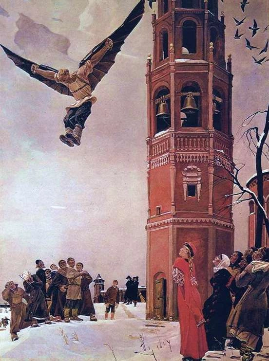 По легенде летом 1565 года некий «холоп Никита» явился в Александровскую слободу, где в это время находился царь Иван Грозный. Именно ему Никита решил продемонстрировать свое изобретение. Из деревянных планок он сконструировал нечто вроде крыльев и прилепил к ним воском птичьи перья. Потом забрался на самый верх Распятской колокольни, надел «крылья» и сиганул вниз. Ветер подхватил смельчака. Управляя воздушными потоками, он пролетел над всей слободой и аккуратно приводнился на речку Серую.