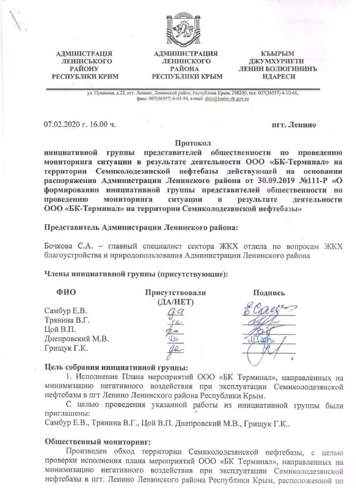 В ноябре 2019 года правительство Крыма приняло решение приостановить деятельность нефтебазы. Немного позже собственник предприятия разработал план мероприятий по устранению выявленных нарушений. В рамках реализации плана мероприятий, направленных на минимизацию негативного воздействия при эксплуатации нефтебазы, инициативная группа в составе общественников и представителей районной администрации неоднократно выходила на объект. Результаты работы комиссии направлялись главе региона Сергею Аксёнову для ознакомления.