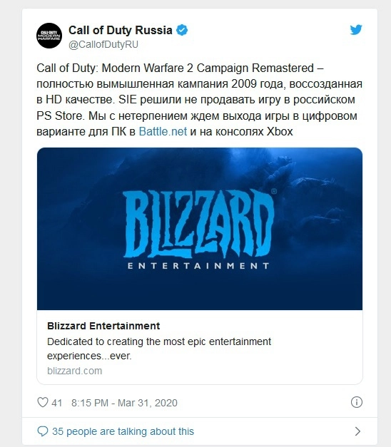 Sony Interactive Entertainment решила не продавать "Modern Warfare 2 Remastered" в магазине PlayStation в России. Мы с нетерпением ждем возможности выпустить игру в цифровой форме в России на Xbox One и компьютерах через Battle.net, — сообщили представители компании.