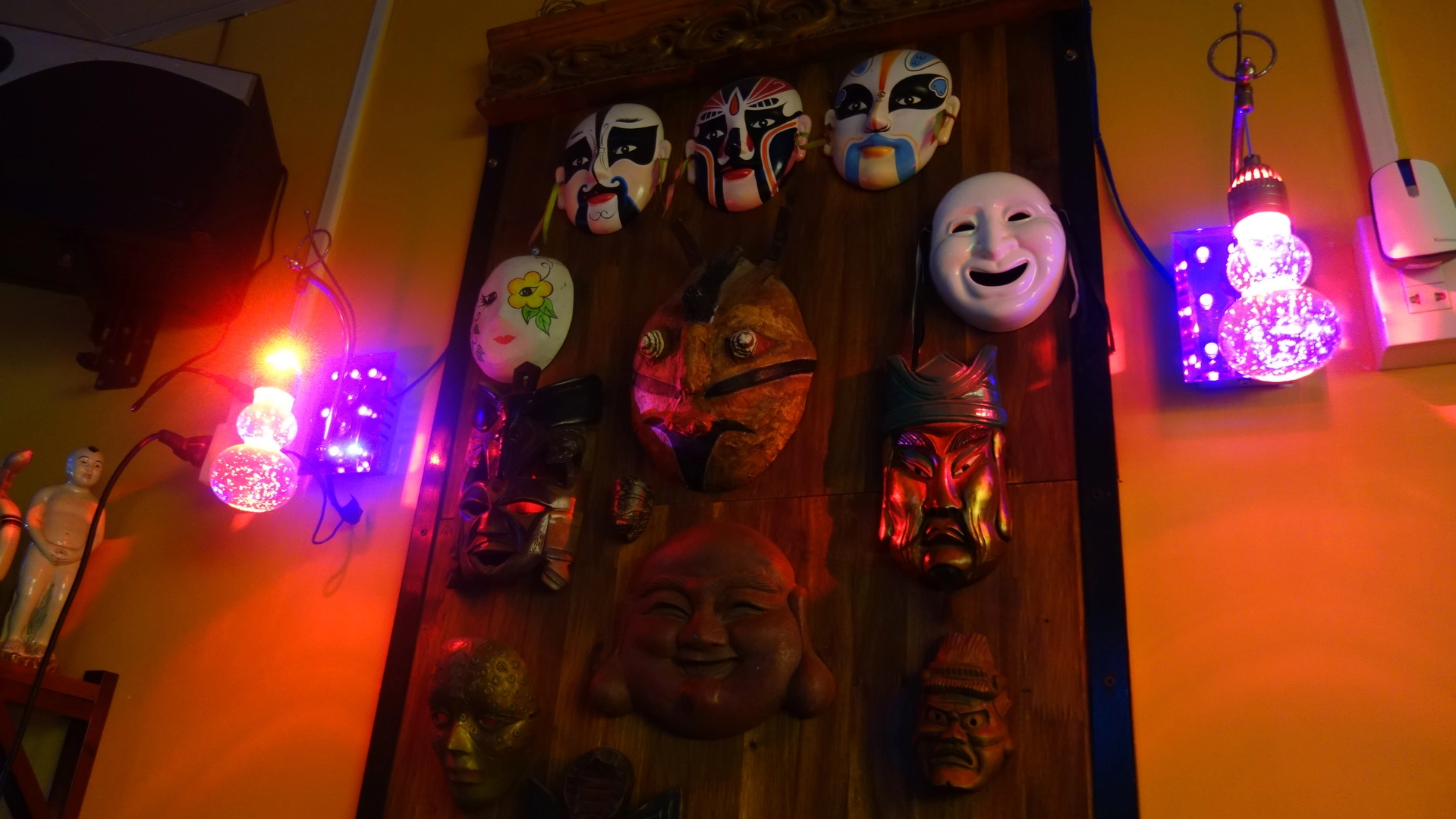 Но мы всё же во Вьетнаме. Потому не весь персонал — русскоговорящий, а на стенах висят вот такие прекрасные местные масочки.