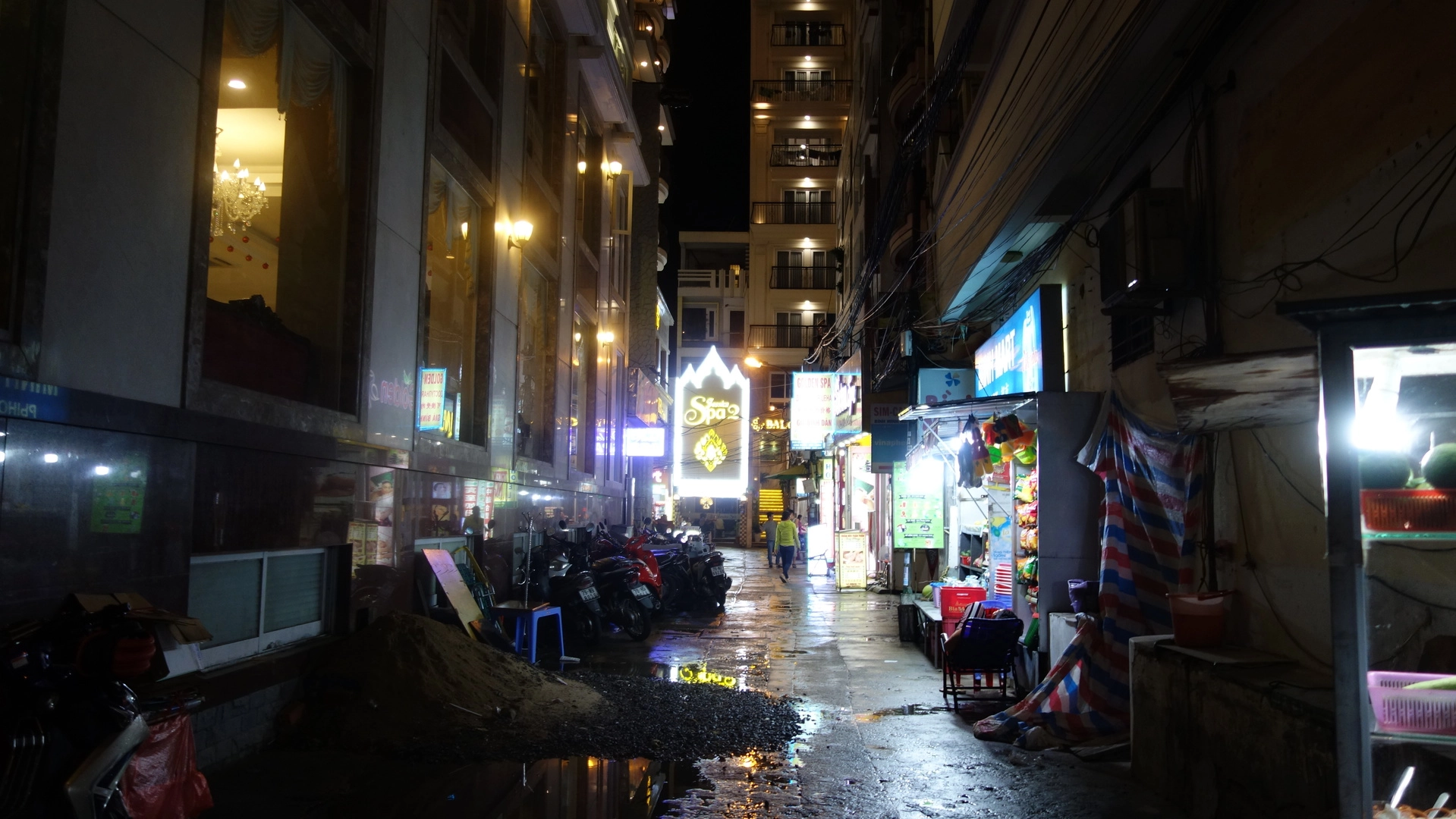 Переулки здесь нередко завалены чем-то, предназначенным для ремонта коммуникаций. Темнеет тут рано — уже в 6 вечера наступает ночь. Выходишь погулять — и повсюду такие вечерние виды.