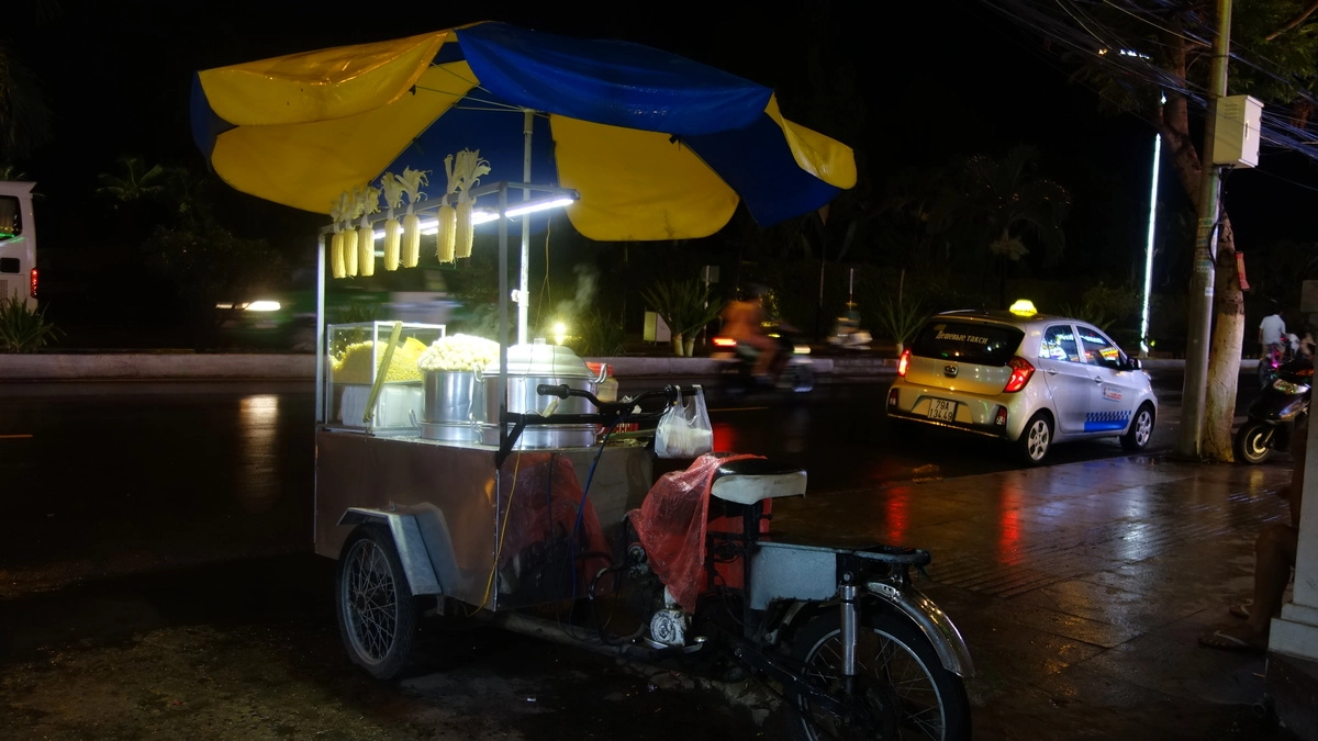 Такая уличная еда в Нячанге повсеместно, даже если из туристического сектора углубиться в сам город. Кукуруза, жареное мясо всех мастей, рыба, морепродукты, креветки на палочке, пирожки какие-то, в том числе и паровые — голод завсегда утолить можно.