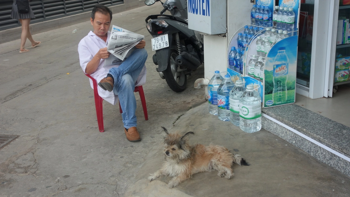 Местный фармацевт из аптеки читает газету в отсутствие покупателей. А рядом с ним — его собачка, которая тоже болтается в аптеке.
