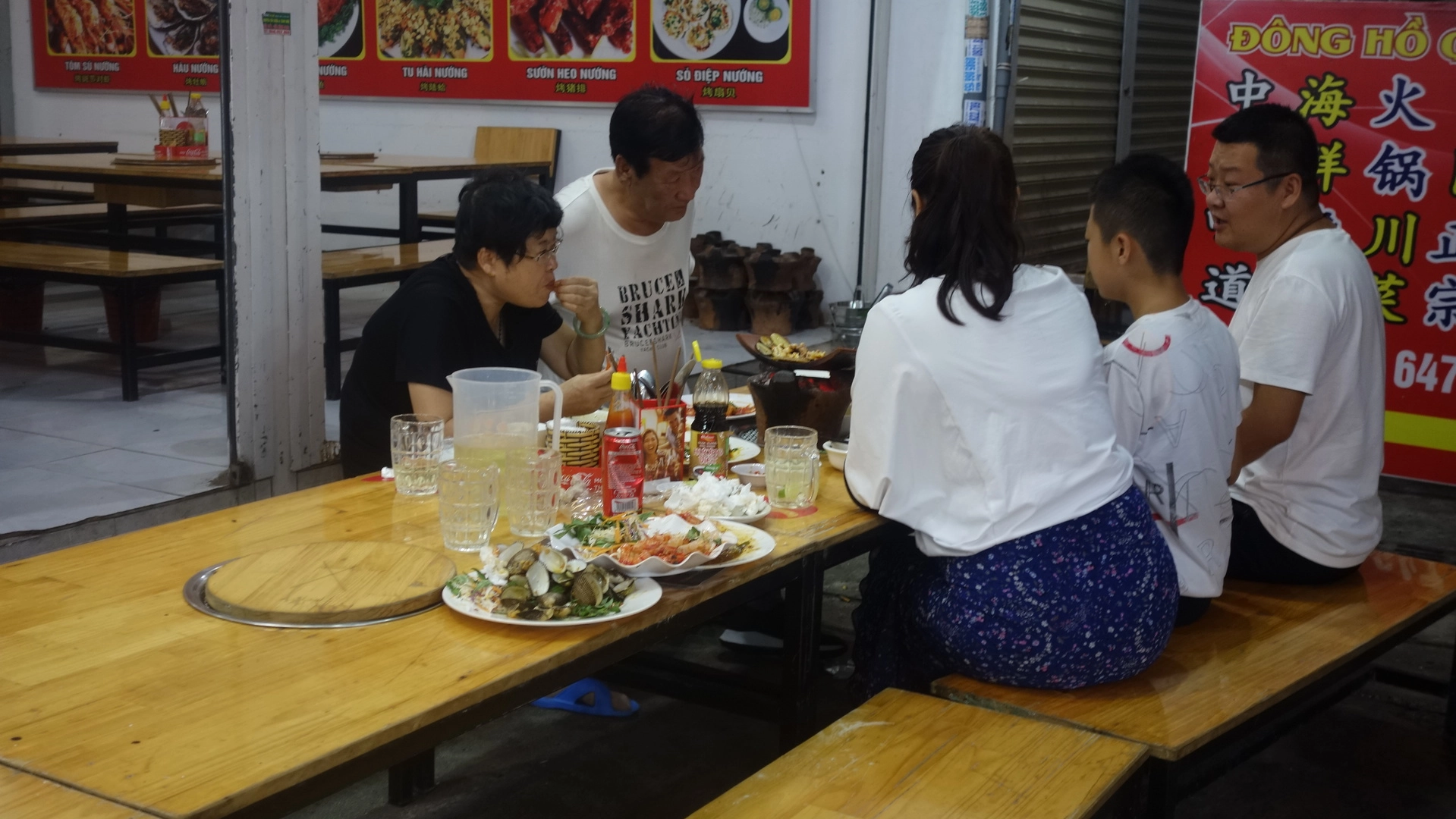 Вьетнамцы по вечерам любят собираться вместе большими компаниями. Нередко к ним присоединяются уличные странники.