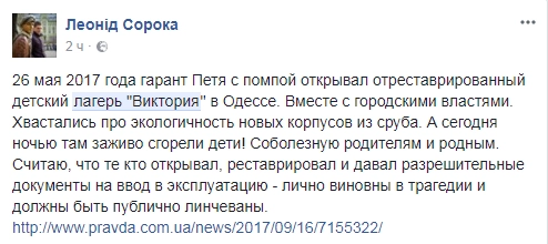 «После проверки количества детей персоналом комплекса, недосчитались 3 девочек (2005−2009 г. р.). При проведении работ по разборке конструкций здания в 2.45 и в 3.02 16 сентября обнаружены фрагменты двух обгоревших детских тел. По состоянию на 7.00 16 сентября продолжаются поиски третьего ребенка», — сообщили в Государственной службе Украины по чрезвычайным ситуациям.