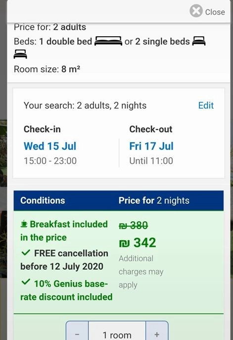 И вот на днях новое недоразумение. Отель в старом Яффо с хорошими отзывами, прекрасная цена. Все отлично. Я был почти честен с ними, не стал указывать совсем уже недействительную карточку, оставляя им возможность проверить действительность карты. Указал российскую дебетовую карту, на которой оставалось около 3000 рублей (примерно $45), прикинув что этой суммы им вполне хватит для проверки карты, а остальное я закину на счет ближе к заселению. И что вы думаете? Через день приходит СМСка о попытке снятия всей суммы бронирования, а это 342 шекеля ($100). Естественно попытка снять деньги не прошла и на следующий день приходит сообщение от Booking’а о том, что отель отменил бронирование, поскольку карточка якобы недействительна.
