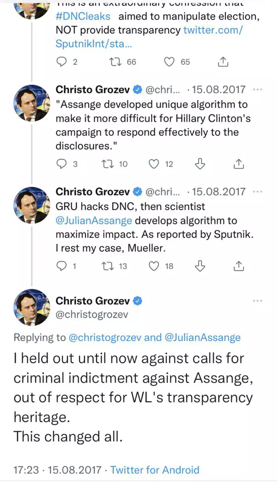 Например, в августе 2017 года сотрудник издания Христо Грозев обвинил Ассанжа во вмешательстве в ход президентских выборов в США в 2016 году: по его словам, это полностью оправдывало уголовное преследование австралийского журналиста.
