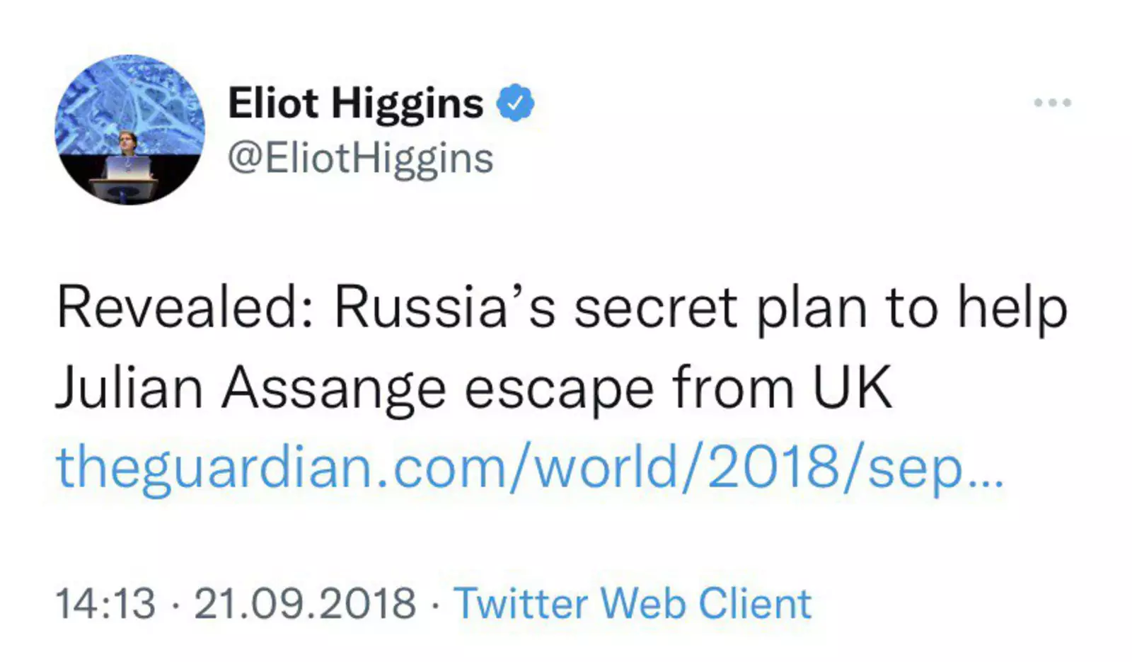 А в сентябре 2018 года основатель Bellingcat* Элиот Хиггинс в своем аккаунте в Twitter опубликовал пост с ссылкой на статью The Guardian, в которой раскрывался якобы секретный план России по спасению Ассанжа. Он также пытался выставить заботу сотрудников эквадорского посольства о нем пустой тратой миллионов долларов.
