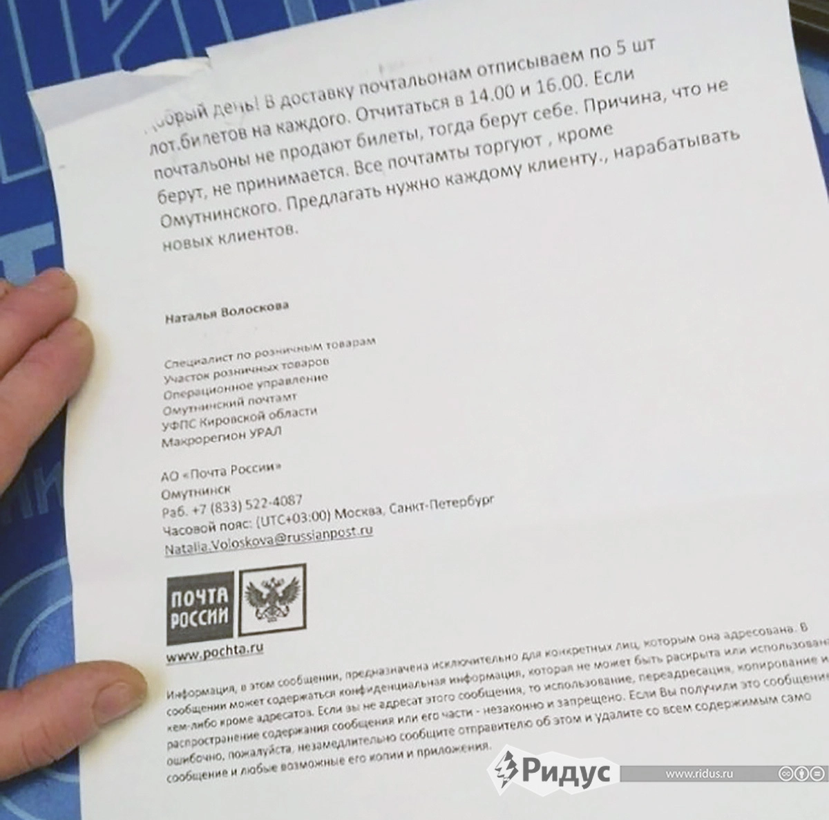 В почтовом отделении ridus.ru подтвердили, что автор данного документа — специалист по розничным товарам УФПС Омутнинского почтамта Кировской области Наталья Волоскова работает в этом отделении почты, однако в данный момент находится в отпуске.