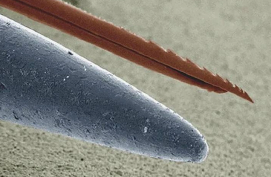 Взгляд под микроскопом на жало пчелы и острие иголки