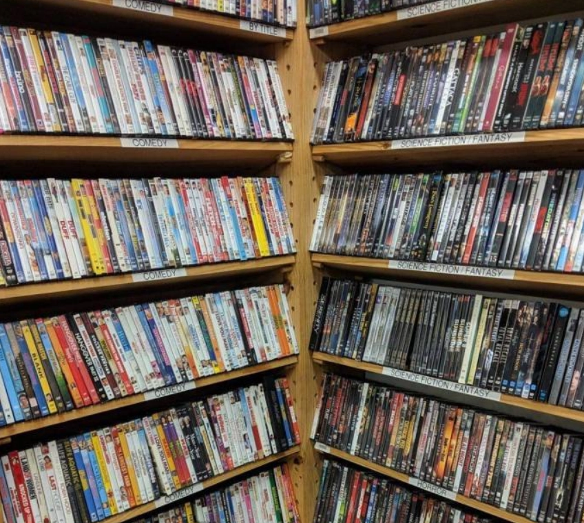 Слева обложки комедийных фильмов, а справа — фантастика и ужасы