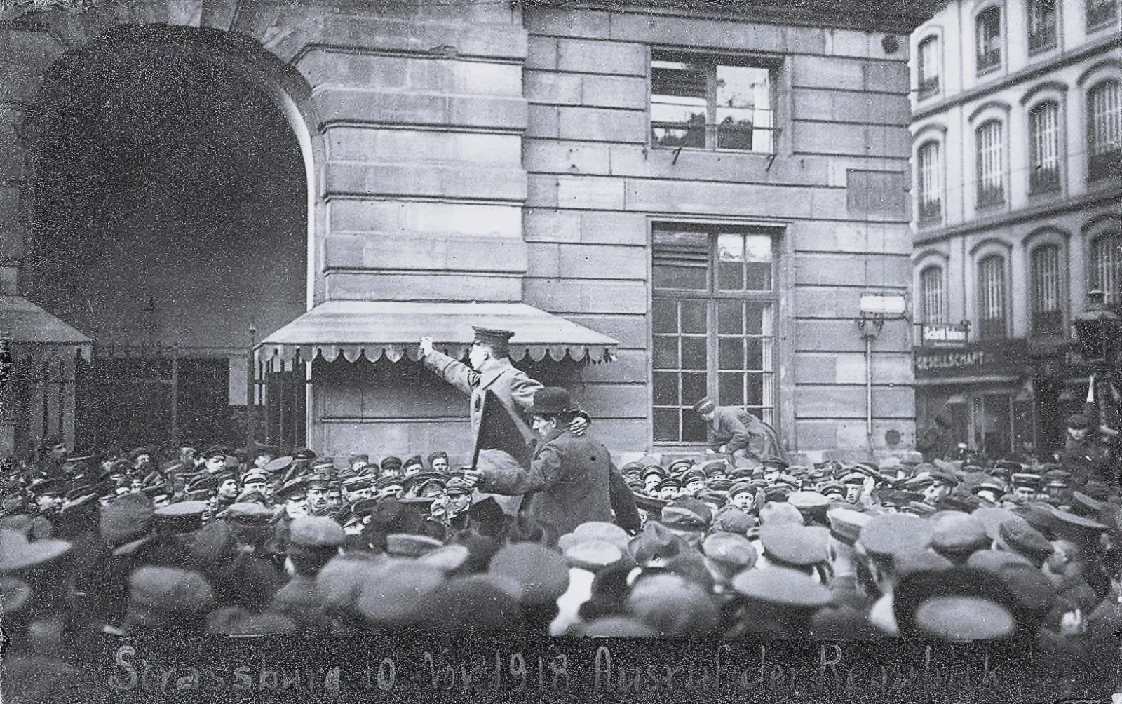 В Страсбурге почти на две недели воцарилось классическое двоевластие. С одной стороны, исполком Советов во главе с Ребхольцем, окопавшийся во Дворце правосудия, и заменивший там бюст кайзера Вильгельма на гипсового Маркса, выкинул лозунг «Ни немцев, ни французов, ни нейтралов! Да здравствует мировая революция!» и поднял красный флаг над Страсбургским собором.