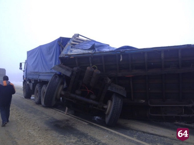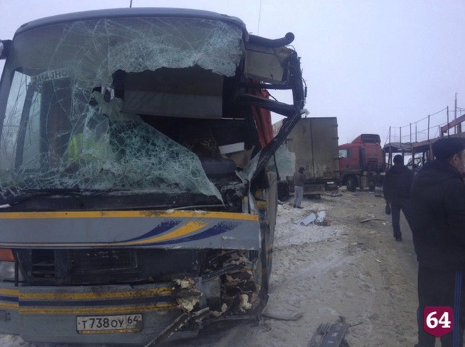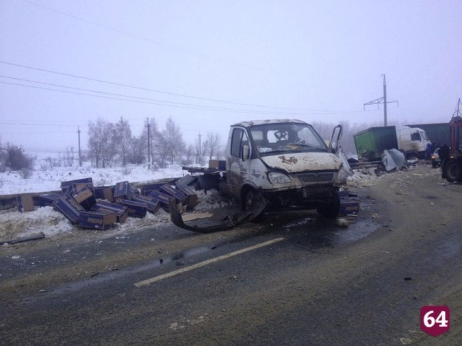 Как сообщил ИА «Регион 64» очевидец происшествия, ДТП случилось на трассе Саратов — Волгоград. По его словам, в настоящее время на обочинах и дороге находятся несколько фур и «газель» со следами столкновения, также у рейсового автобуса, предположительно, ехавшего по маршруту Саратов — Москва, серьезно повреждена кабина.