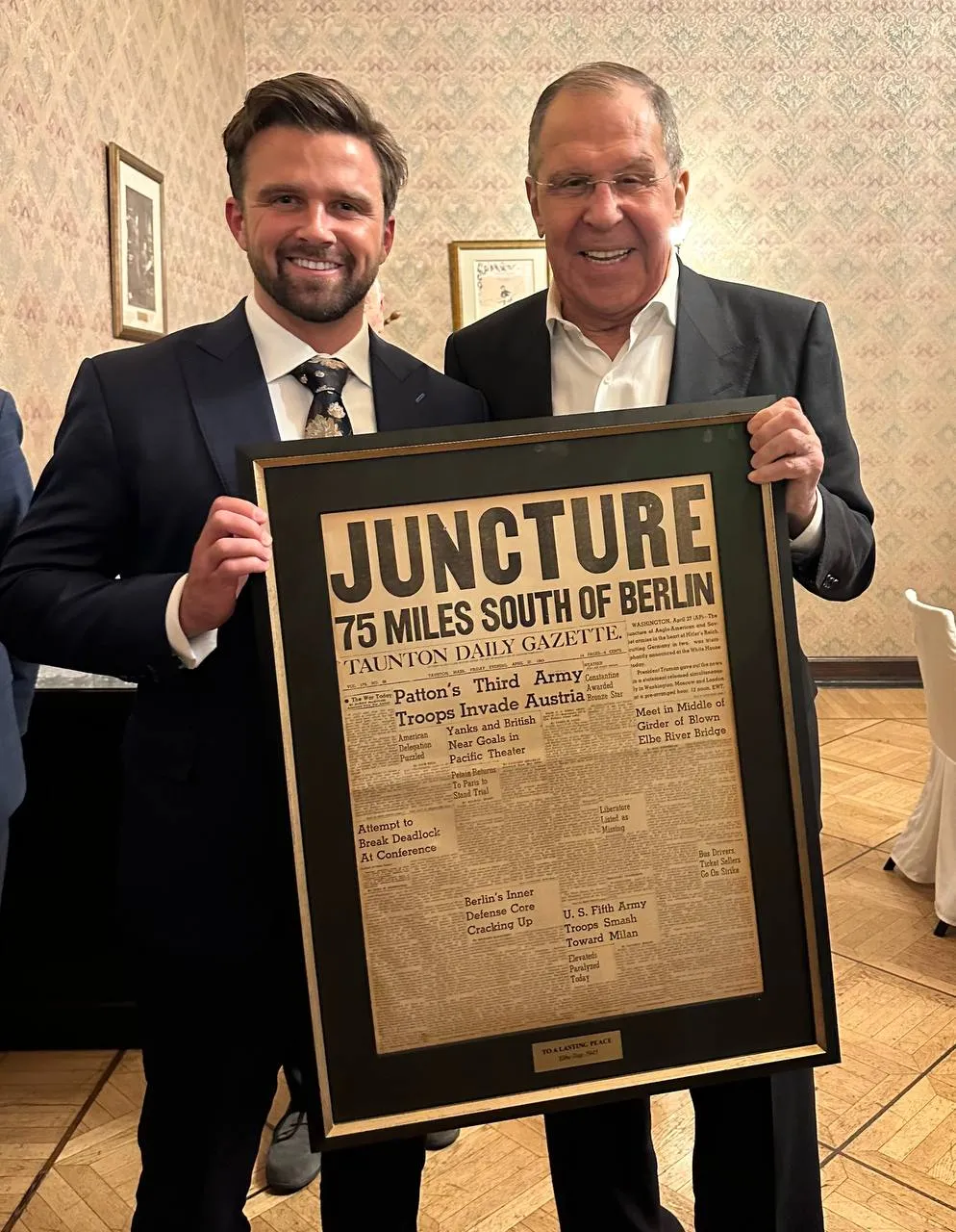 «От имени американских патриотов я подарил Лаврову газету 1945 года, в которой сообщалось о Дне Эльбы — дне, когда американские и советские войска впервые объединились на поле боя во время Второй мировой войны, разделив Германию пополам», — уточнил он.