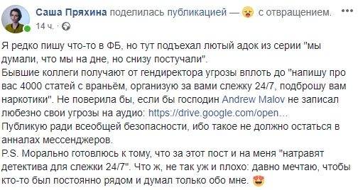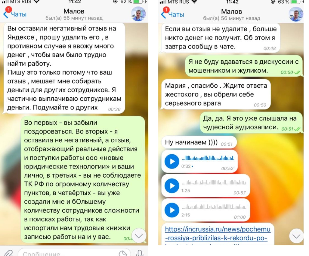 Я пытаюсь донести информацию, мой отзыв не негативный, он реальный, он отображает положение дел в компании. Мне он угрожал легко, заявлял, что распространил обо мне разную информацию в СМИ и я потом нигде работу не найду. А моей коллеге он угрожал тем, что потратит полмиллиона и подкинет наркотики, при этом он отмечал, что знает, как это делается, и умеет это делать. После того как я написала пост в Facebook, он замолчал, — рассказала «Ридусу» одна из сотрудниц «Новых юридических технологий» по имени Мария.