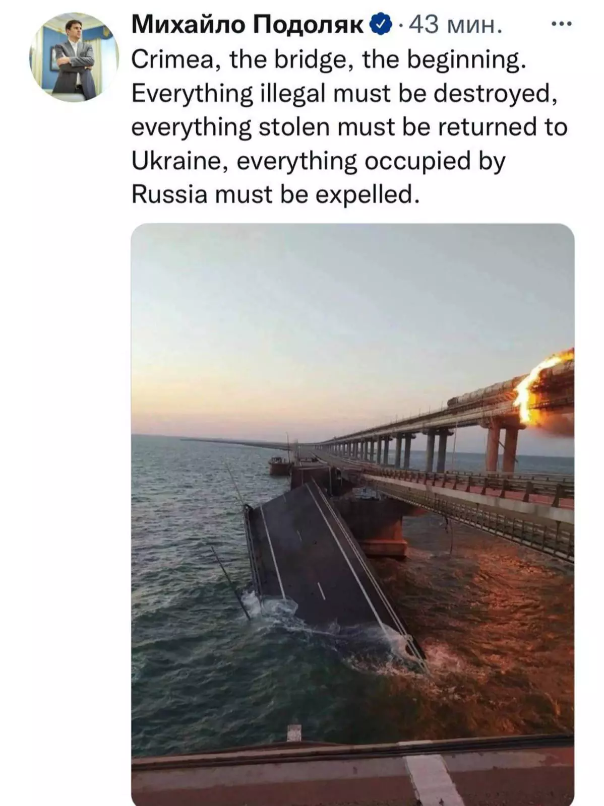 «Крым, мост, начало. Все незаконное должно быть разрушено, все украденное должно быть возвращено Украине, все оккупированное Россией должно быть уничтожено», — написал он в Twitter.