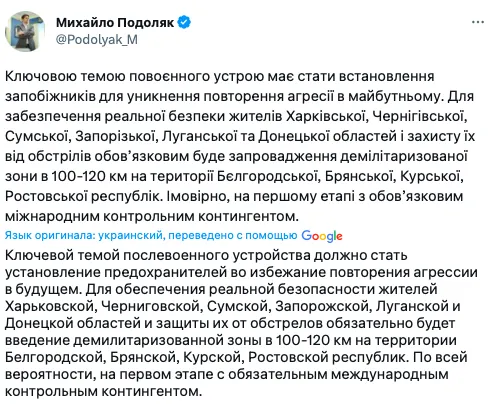«Для избежания повторения боевых действий в будущем необходимо будет введение демилитаризованной зоны в Белгородской, Брянской, Курской и Ростовской областях. На первом этапе эти территории должны находиться под контролем международного контингента», — написал Подоляк в социальных сетях.