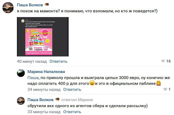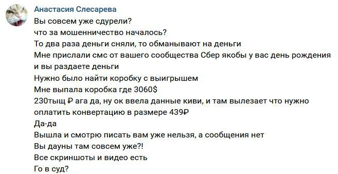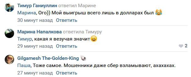 Подписчики официальной группы «Сбера» в социальной сети «ВКонтакте» пожаловались на массовую рассылку мошеннических писем. По их словам, им начали поступать уведомления о розыгрыше призов.