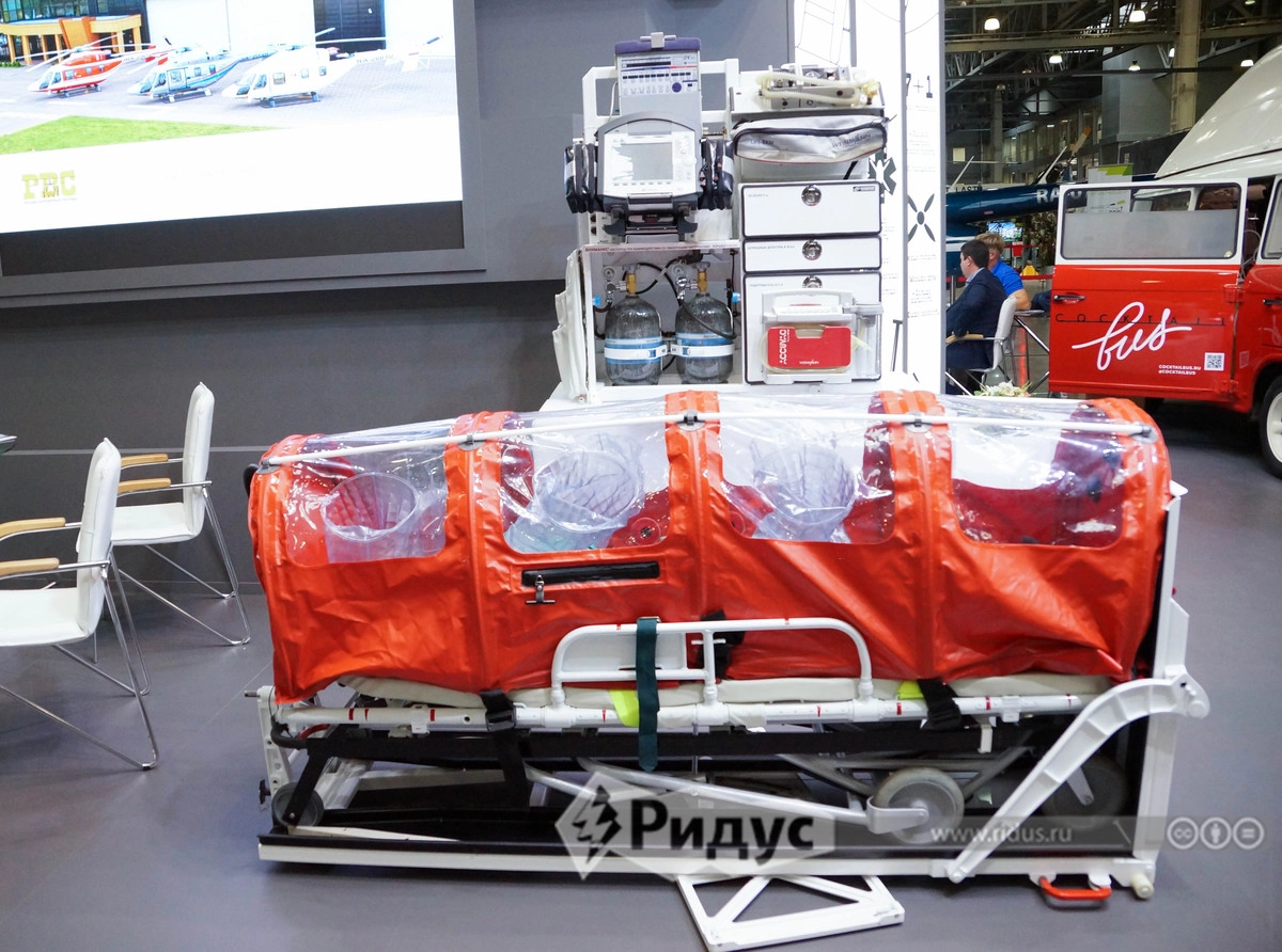 В условиях пандемии одной из актуальных новинок, представленных на выставке, стал транспортировочный инфекционный бокс. АО «Русские вертолетные системы» продемонстрировало бокс, которым оснащены вертолеты компании.