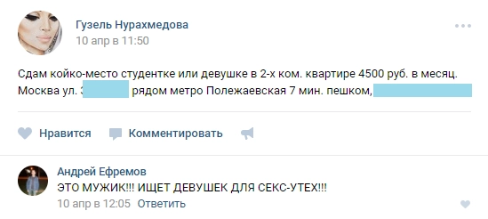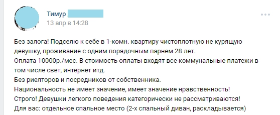 Пожалуй, сейчас проще всего сдать или снять квартиру через соцсети. Иногда в тематических группах появляются забавные, а порой и вовсе странные объявления. «Ридус» составил подборку самых интересных из них.