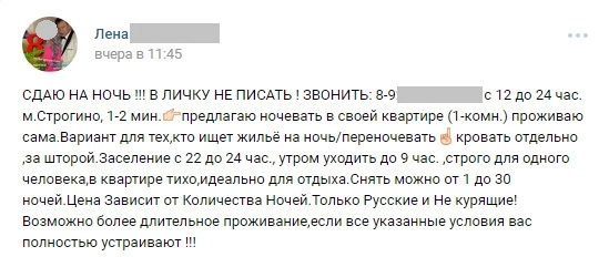 Некоторые арендодатели сразу показывают съемщикам, кто здесь главный. «Сдаю на ночь!!! Уходить до 9 утра!» — эмоционально сообщает одна из участниц группы «ВКонтакте».