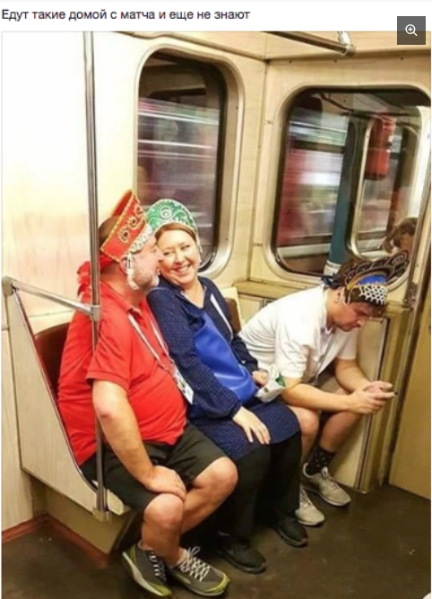 Трио болельщиков стало настолько популярным, что теперь за ними следят. Кто-то уже сфотографировал позитивную троицу в метро. Снимок превратился в новый мем.