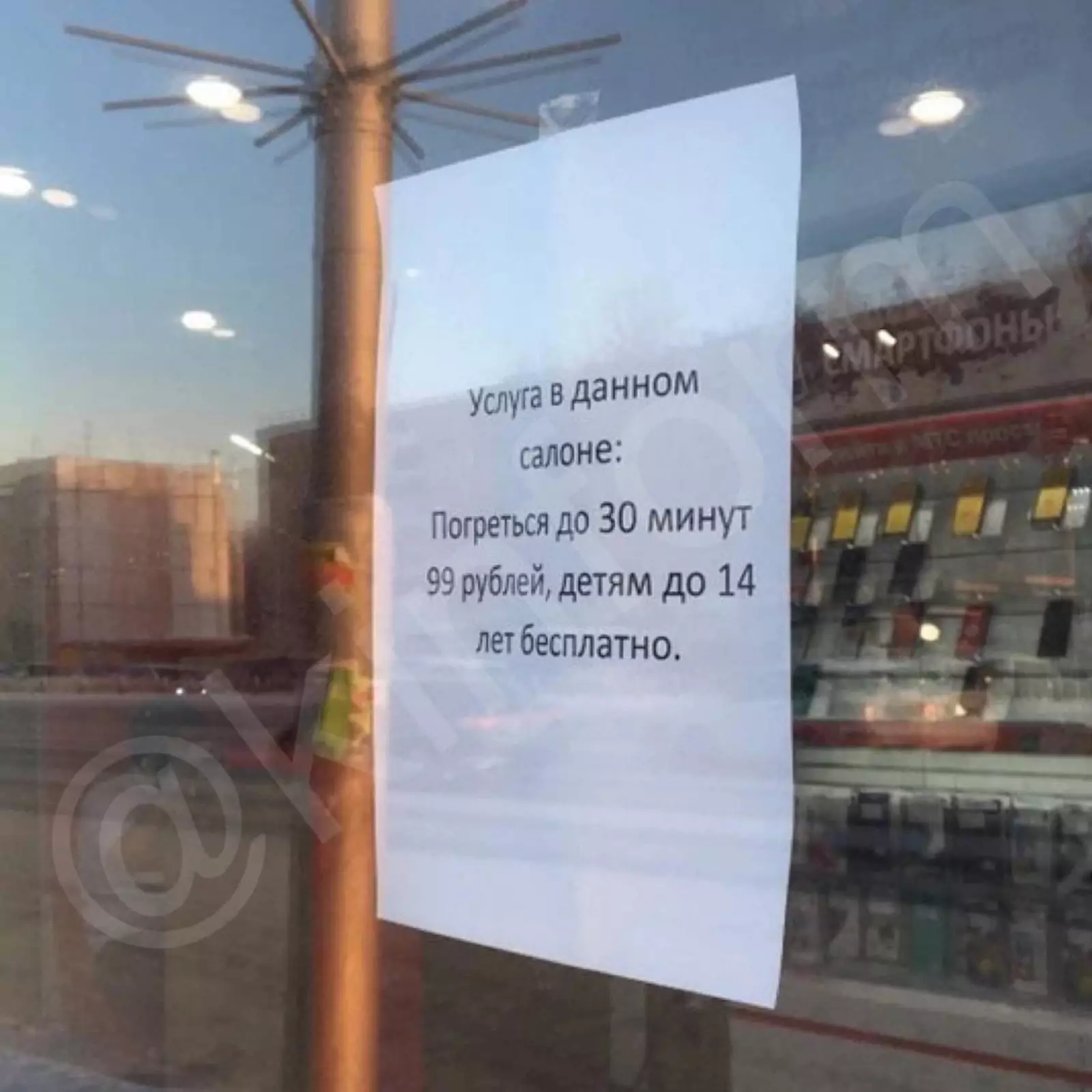Согласно прейскуранту, чтобы побыть в тепле полчаса, взрослому придется заплатить 99 рублей, для детей до 14 лет «услуга» бесплатна. Подобные объявления появились на остановочных павильонах, внутри которых находятся салоны мобильной связи.