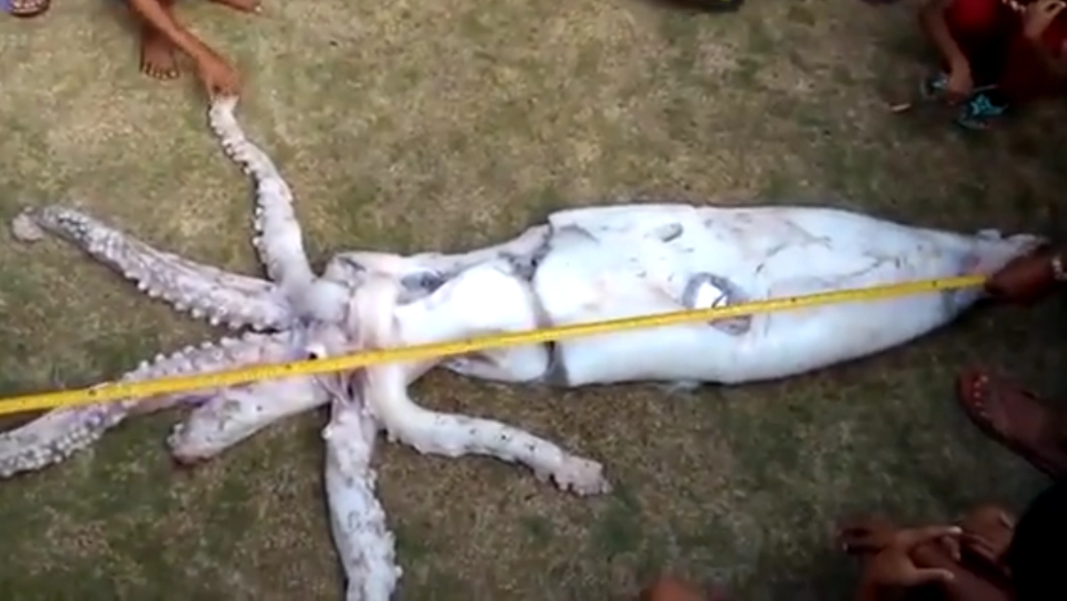 Филиппинский рыбак поймал кальмара длиной 2,5 метра, который произвел довольно сильное впечатление на местных жителей. Они собрались вокруг огромного морского существа, измерили его и сняли на видео.