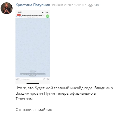 «Что ж, это будет мой главный инсайд года. Владимир Владимирович Путин теперь официально в Telegram. Отправила смайлик», — пишет Потупчик.