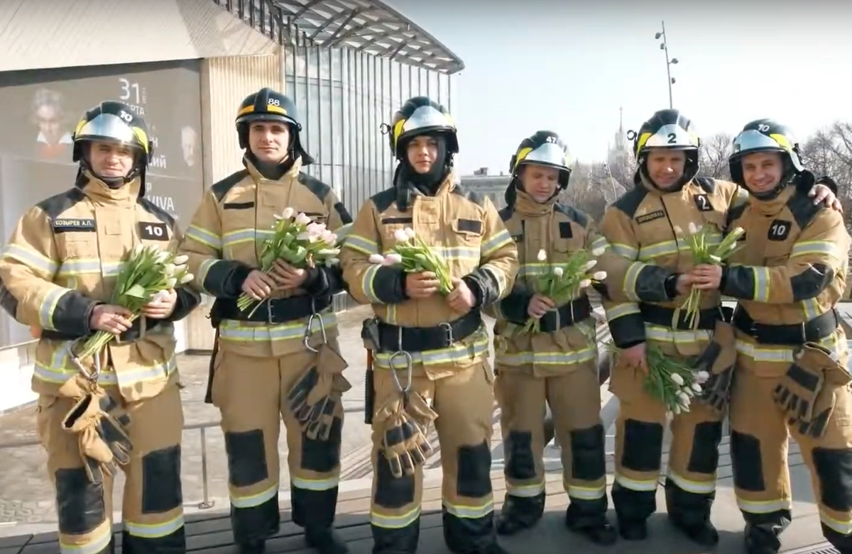 Во время выступлений оркестра пожарные и спасатели московских гарнизонов вручали женщинам букеты тюльпанов.