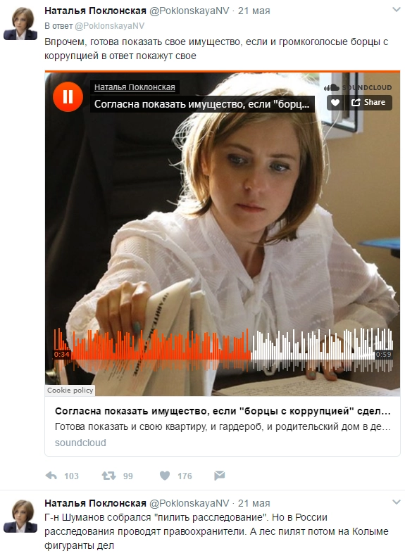 В ответ Поклонская заметила, что пилят лес на Колыме, а расследование проводят правоохранители. Однако она согласилась показать свое имущество, если сотрудники Transparency International Russia в ответ покажут свое.