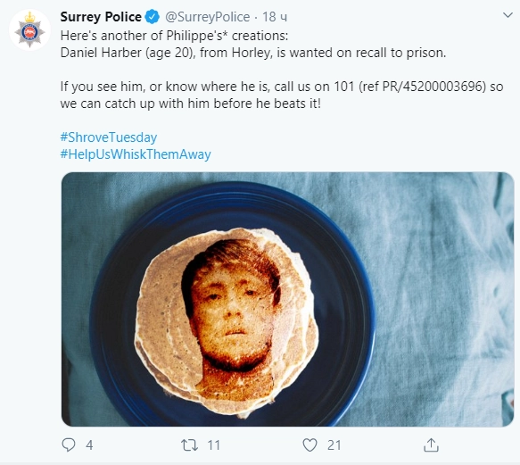 Полиция британского графства Суррей применила необычный метод оповещения населения о поиске преступников и подозреваемых. Теперь фотографии тех, кого разыскивают правоохранители, размещаются не просто на специальном стенде или в соцсетях, а на поверхности блинов.