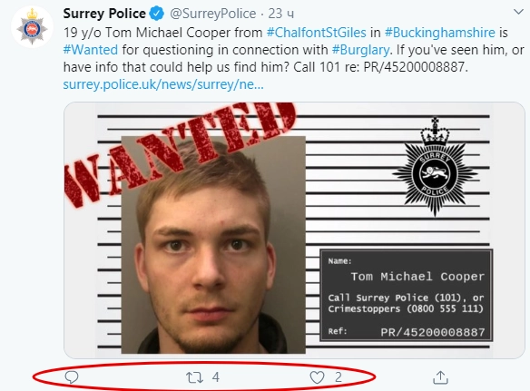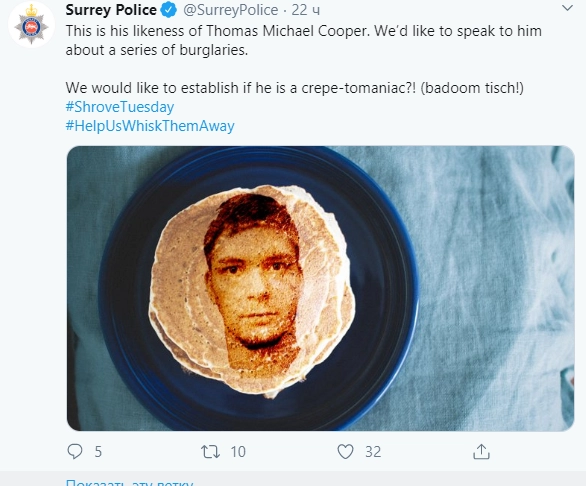 Оригинальный подход к объявлениям «Их разыскивает полиция» принес свои плоды. Твит с лицом предполагаемого взломщика Томаса Майкла Купера на блинчике привлек в разы больше пользователей соцсети, чем традиционное объявление о подозреваемом.