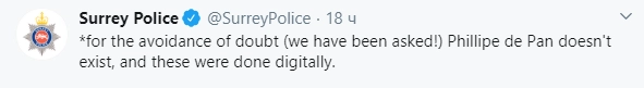 Как утверждает полиция Суррея, ей якобы удалось привлечь к сотрудничеству некоего «знаменитого кулинара Филиппа де Пэна, который помогает нам в розыске посредством своего искусства». Портреты объявленных в розыск за кражи со взломом и побеги из мест лишения свободы появились в официальном микроблоге стражей порядка.