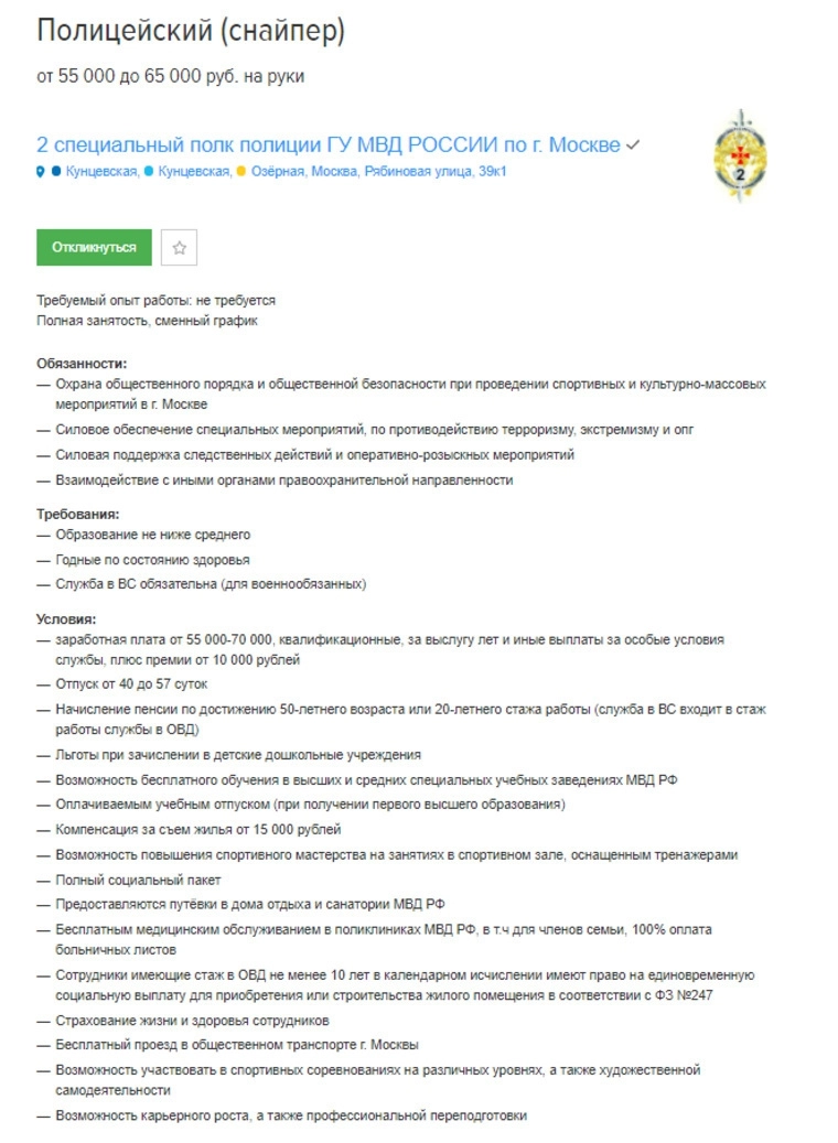 В списке условий в объявлении сказано, что полицейский-снайпер может рассчитывать на отпуск продолжительностью от 40 до 57 суток, начисление пенсии по достижении 50-летнего возраста или 20-летнего стажа работы, компенсацию за съем жилья от 15 тысяч рублей.