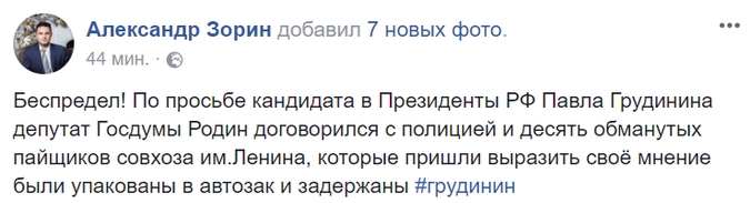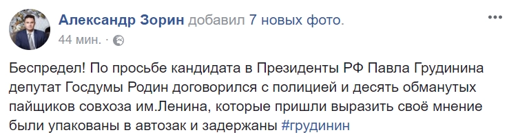 Лидер «Партии свободных граждан» Александр Зорин пишет на своей странице в Facebook, будто задержания прошли по личной просьбе самого Павла Грудинина и депутата Госдумы Владимира Родина.
